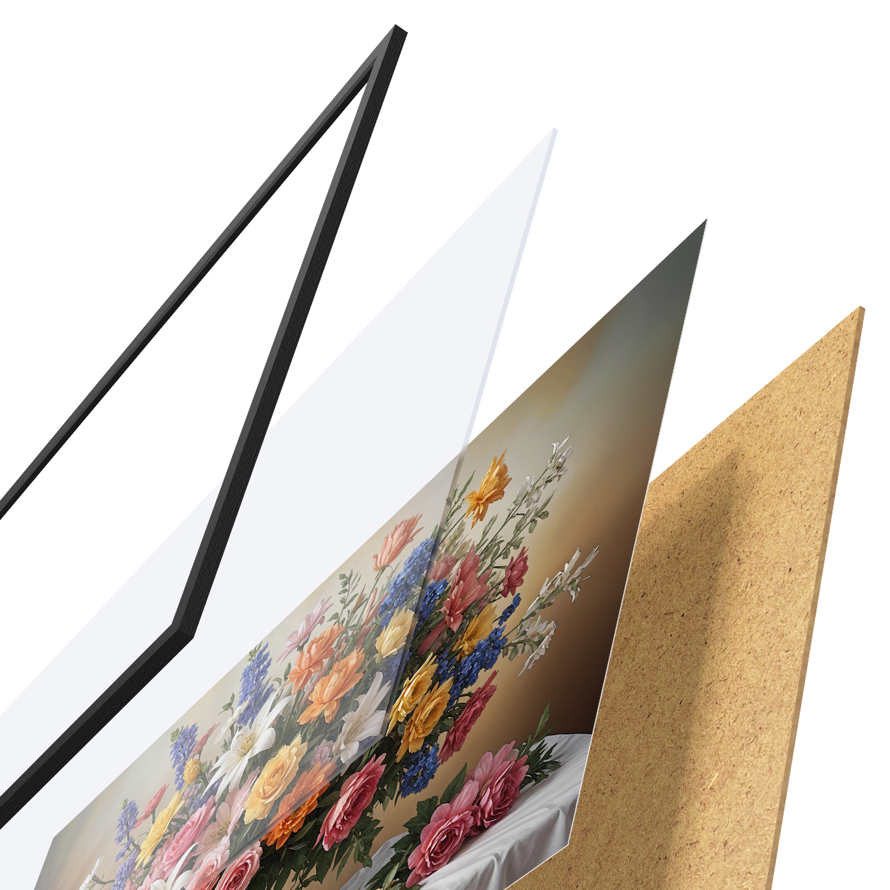 El póster consta de marco, plexiglás, imagen impresa y soporte de aglomerado. El póster puede colgarse inmediatamente en la pared gracias a los soportes de la parte posterior.