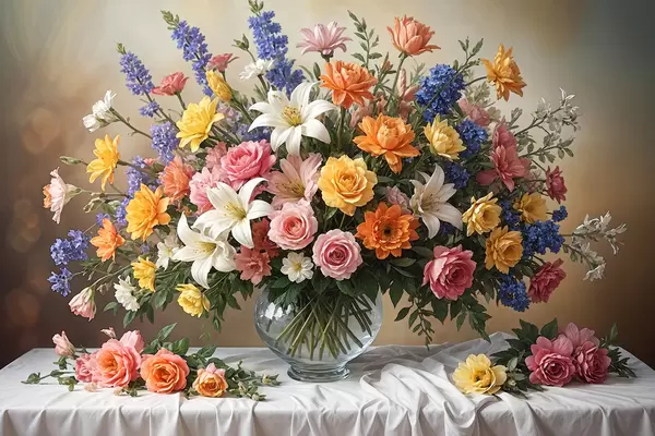 Poster Un vibrante ramo de varias flores de colores en un jarrón de vidrio sobre un mantel blanco, pintura artística vintage f38825