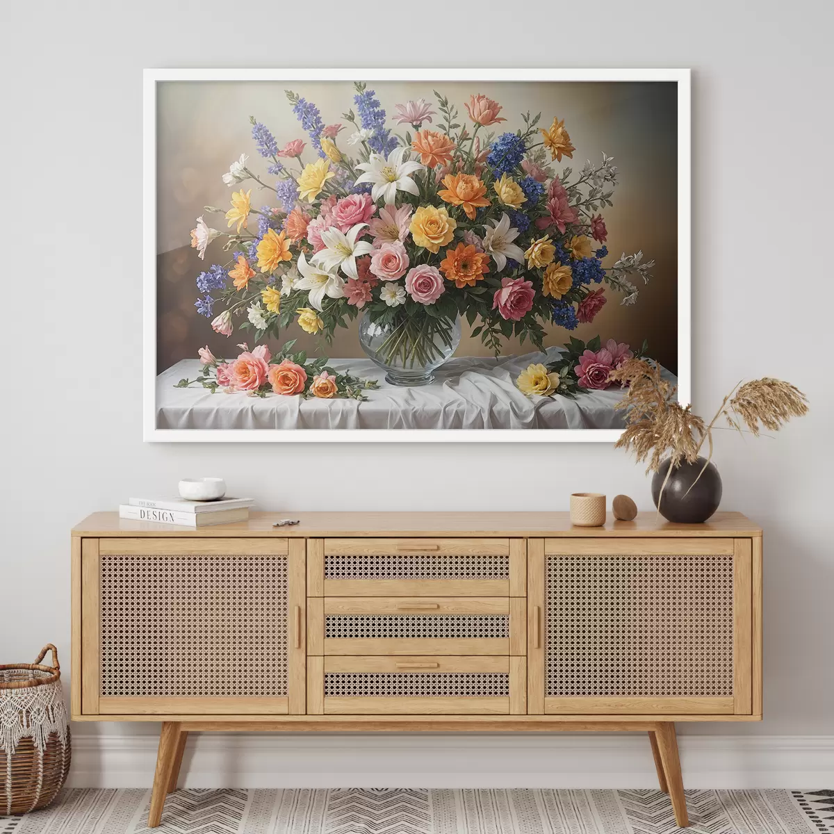 Poster Un vibrante ramo de varias flores de colores en un jarrón de vidrio sobre un mantel blanco, pintura artística vintage Nr f38825