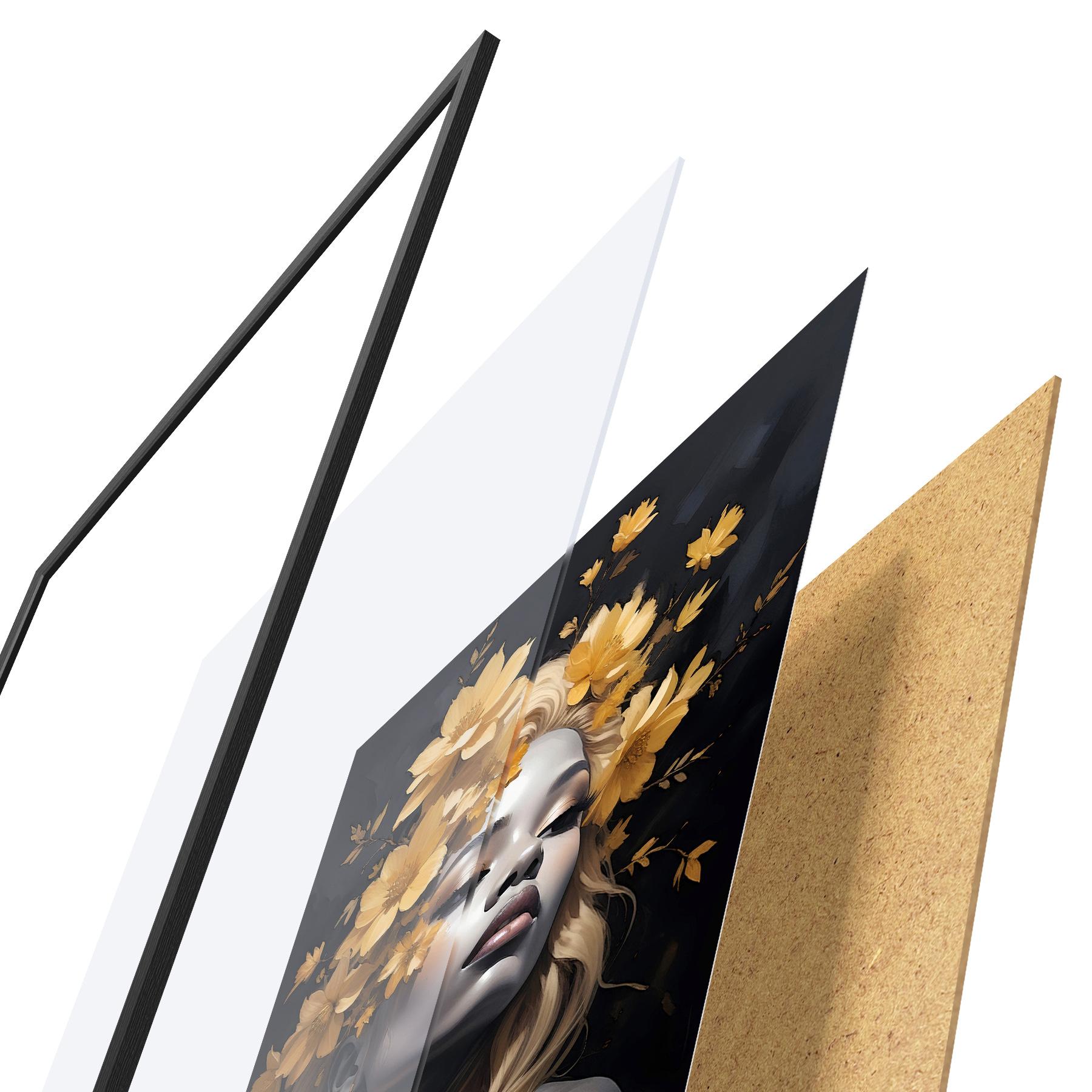 El póster consta de marco, plexiglás, imagen impresa y soporte de aglomerado. El póster puede colgarse inmediatamente en la pared gracias a los soportes de la parte posterior.