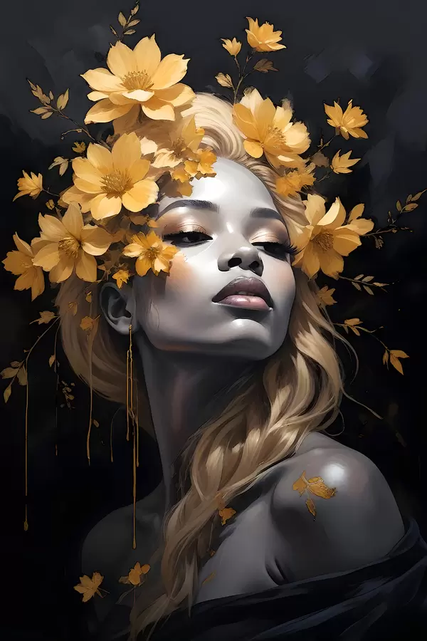 Poster Un retrato de una mujer joven rodeada de hojas de otoño de amarillo sobre un fondo oscuro Nr f38834