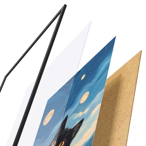 El póster consta de marco, plexiglás, imagen impresa y soporte de aglomerado. El póster puede colgarse inmediatamente en la pared gracias a los soportes de la parte posterior.