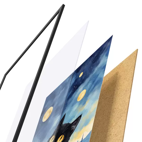 El póster consta de marco, plexiglás, imagen impresa y soporte de aglomerado. El póster puede colgarse inmediatamente en la pared gracias a los soportes de la parte posterior.