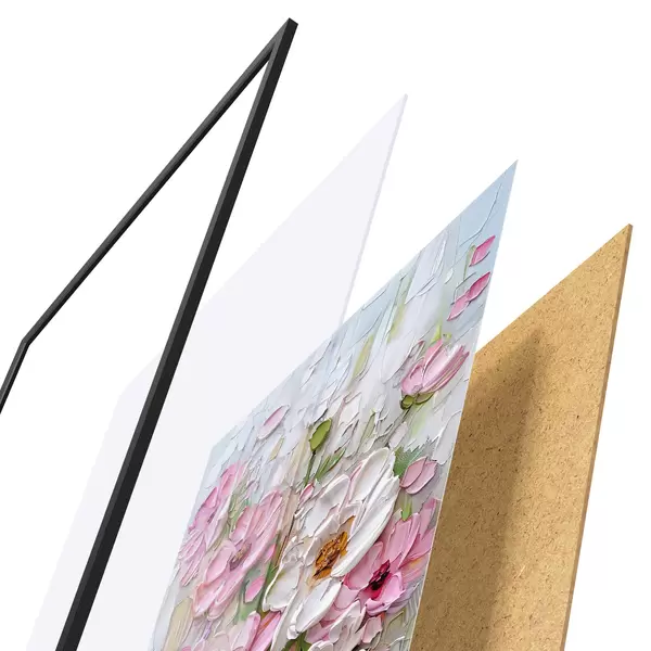 El póster consta de marco, plexiglás, imagen impresa y soporte de aglomerado. El póster puede colgarse inmediatamente en la pared gracias a los soportes de la parte posterior.
