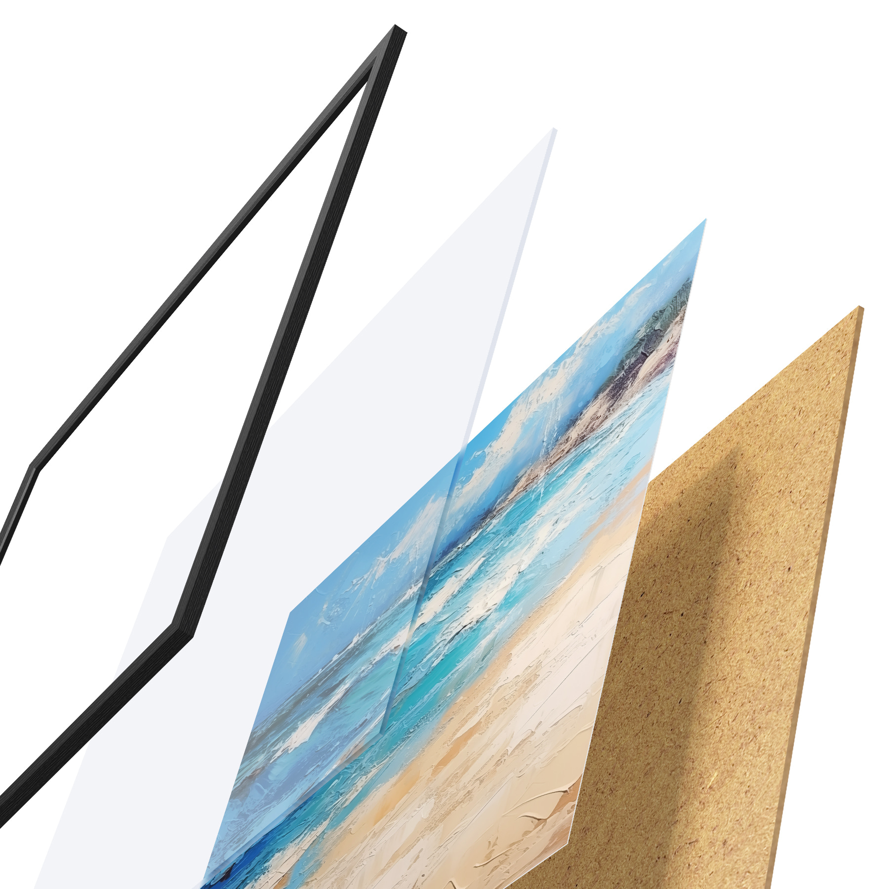 El póster consta de marco, plexiglás, imagen impresa y soporte de aglomerado. El póster puede colgarse inmediatamente en la pared gracias a los soportes de la parte posterior.