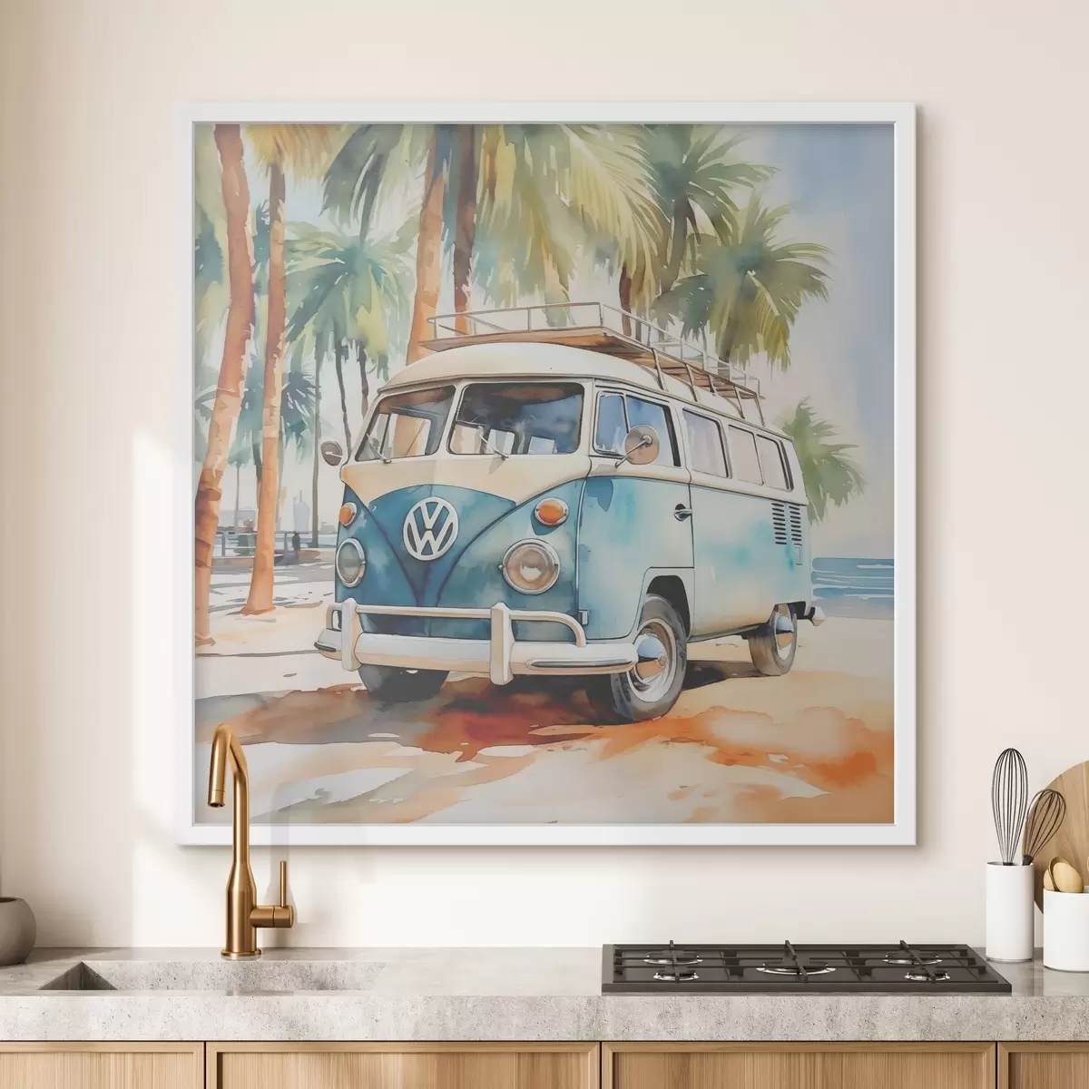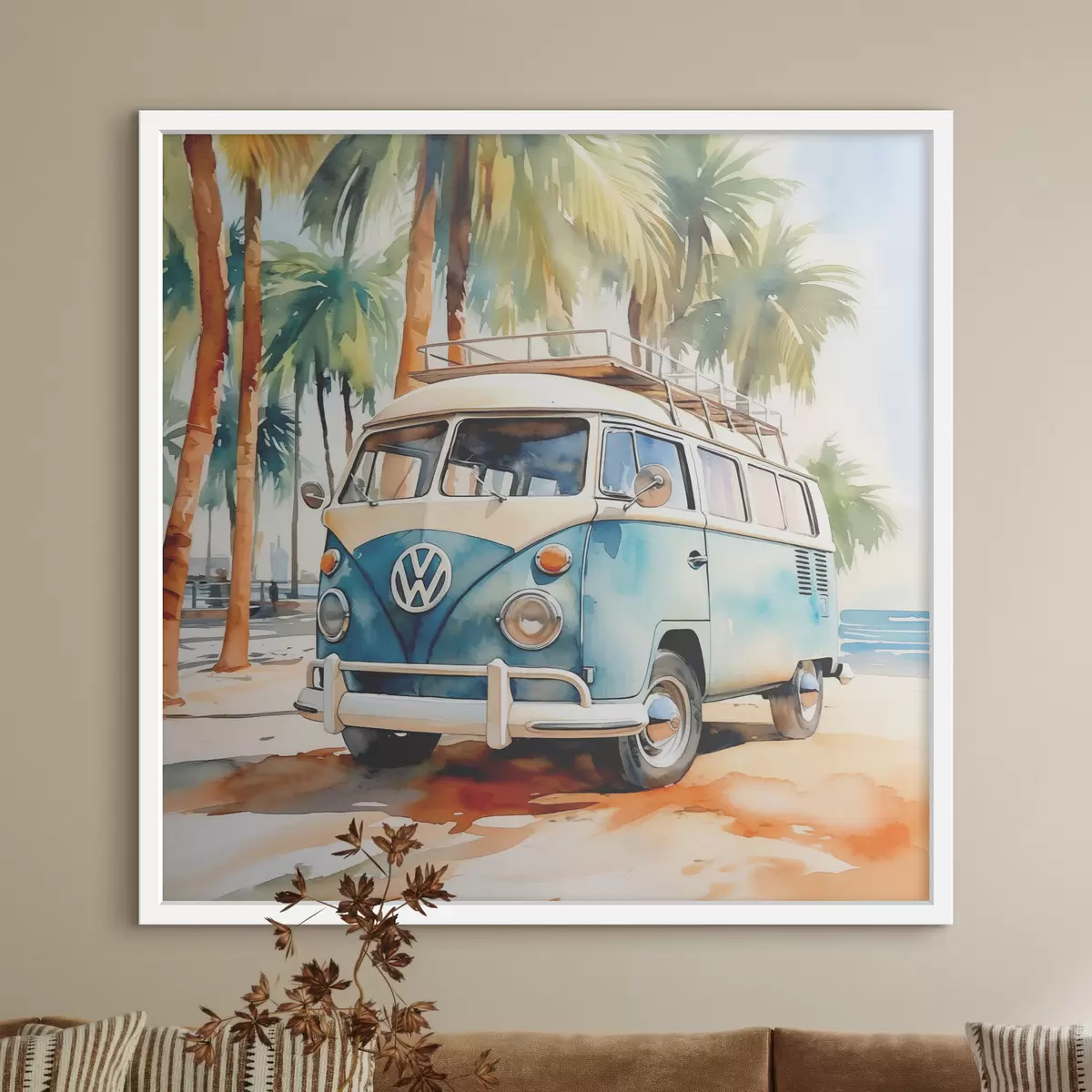 Poster Un coche de viaje aparcado en la playa sobre un fondo de palmeras en acuarela Nr f38911