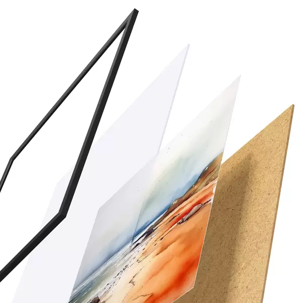 El póster consta de marco, plexiglás, imagen impresa y soporte de aglomerado. El póster puede colgarse inmediatamente en la pared gracias a los soportes de la parte posterior.