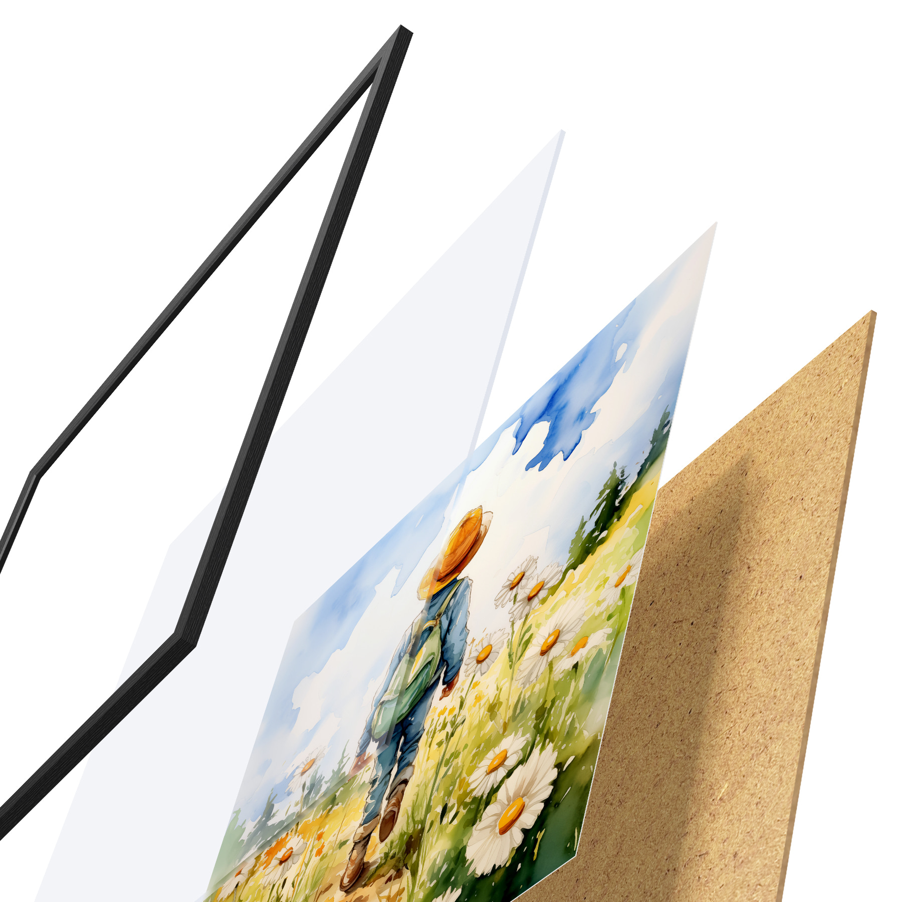 Poster Un niño con un sombrero de vaquero, una mochila verde a la espalda y un traje azul camina por un sendero en un campo de manzanilla, acuarela Nr f38946