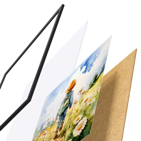 El póster consta de marco, plexiglás, imagen impresa y soporte de aglomerado. El póster puede colgarse inmediatamente en la pared gracias a los soportes de la parte posterior.