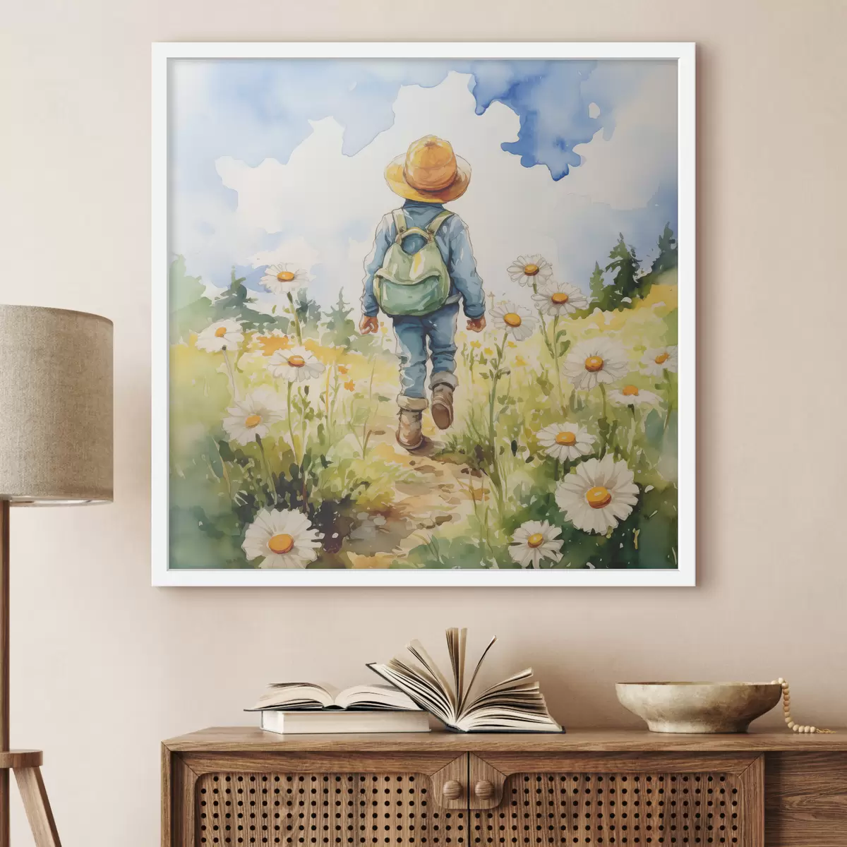 Poster Un niño con un sombrero de vaquero, una mochila verde a la espalda y un traje azul camina por un sendero en un campo de manzanilla, acuarela Nr f38946