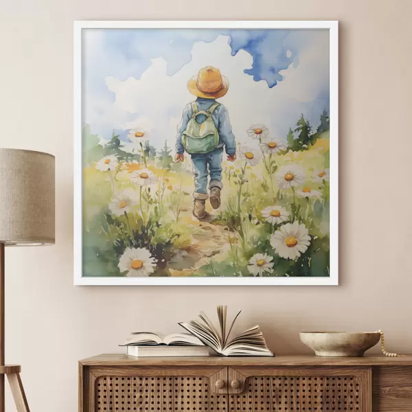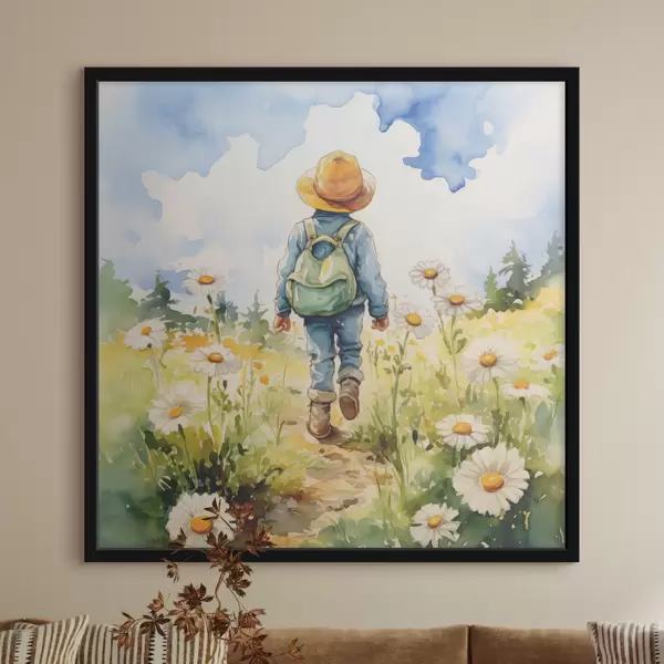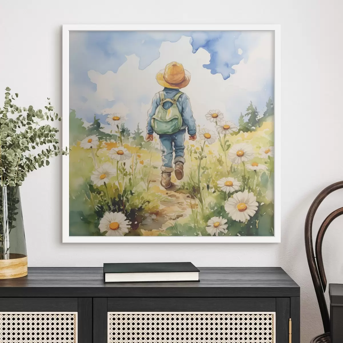 Poster Un niño con un sombrero de vaquero, una mochila verde a la espalda y un traje azul camina por un sendero en un campo de manzanilla, acuarela f38946