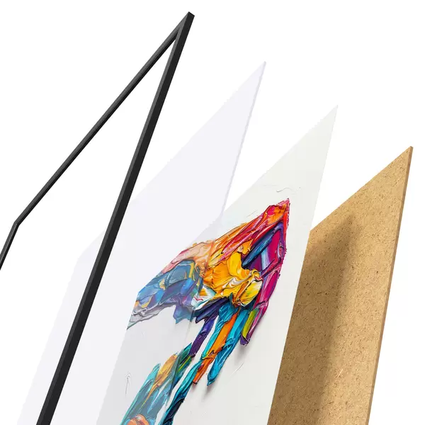 El póster consta de marco, plexiglás, imagen impresa y soporte de aglomerado. El póster puede colgarse inmediatamente en la pared gracias a los soportes de la parte posterior.