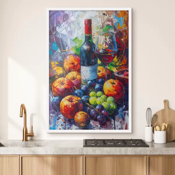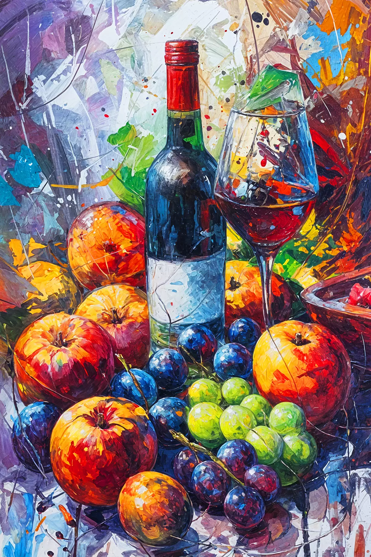 Poster Bodegón abstracto con una botella de vino, una copa de vino y frutas coloridas con toques de varios colores Nr f38958