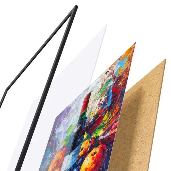 El póster consta de marco, plexiglás, imagen impresa y soporte de aglomerado. El póster puede colgarse inmediatamente en la pared gracias a los soportes de la parte posterior.
