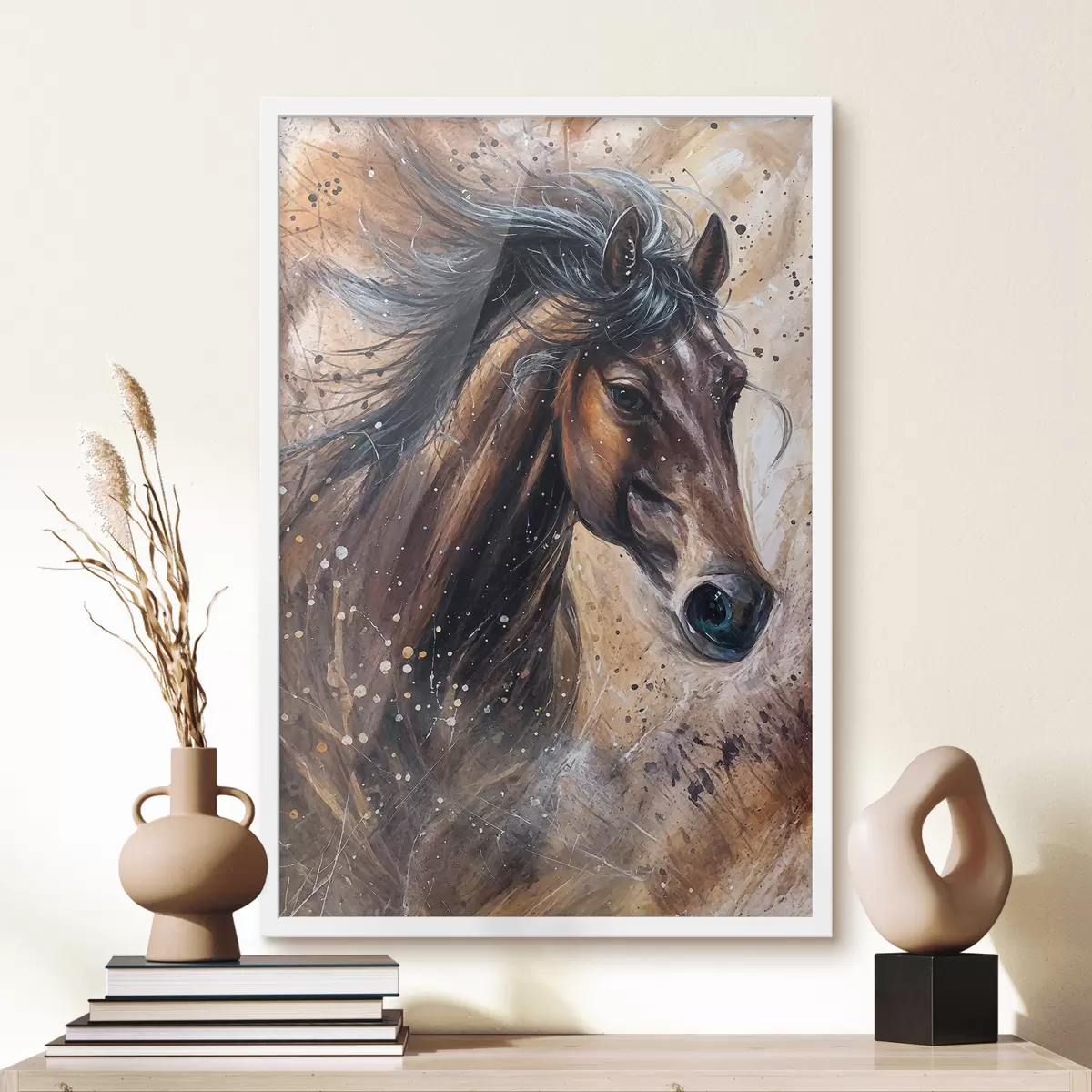 Poster Pintura de un caballo marrón con melena suelta, sobre un fondo texturizado con toques de color Nr f38959