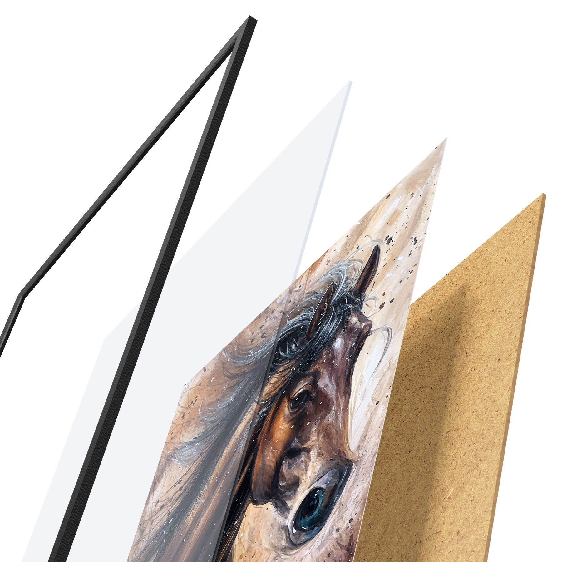 El póster consta de marco, plexiglás, imagen impresa y soporte de aglomerado. El póster puede colgarse inmediatamente en la pared gracias a los soportes de la parte posterior.