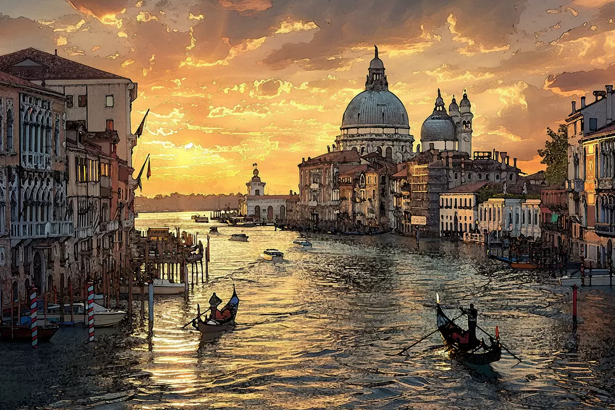 Poster Una pintura con vistas panorámicas del Gran Canal de Venecia, Italia, al atardecer. f38963