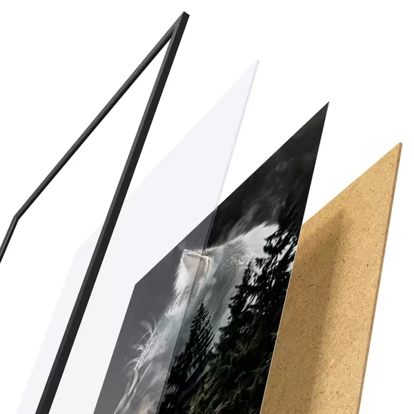 El póster consta de marco, plexiglás, imagen impresa y soporte de aglomerado. El póster puede colgarse inmediatamente en la pared gracias a los soportes de la parte posterior.