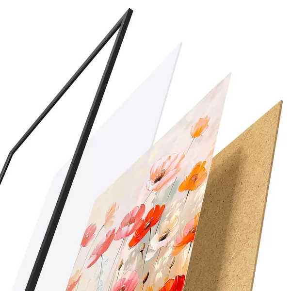 El póster consta de marco, plexiglás, imagen impresa y soporte de aglomerado. El póster puede colgarse inmediatamente en la pared gracias a los soportes de la parte posterior.
