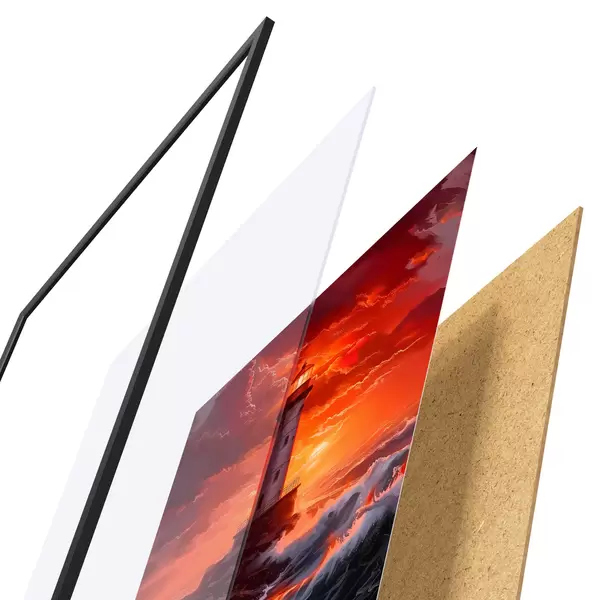 El póster consta de marco, plexiglás, imagen impresa y soporte de aglomerado. El póster puede colgarse inmediatamente en la pared gracias a los soportes de la parte posterior.