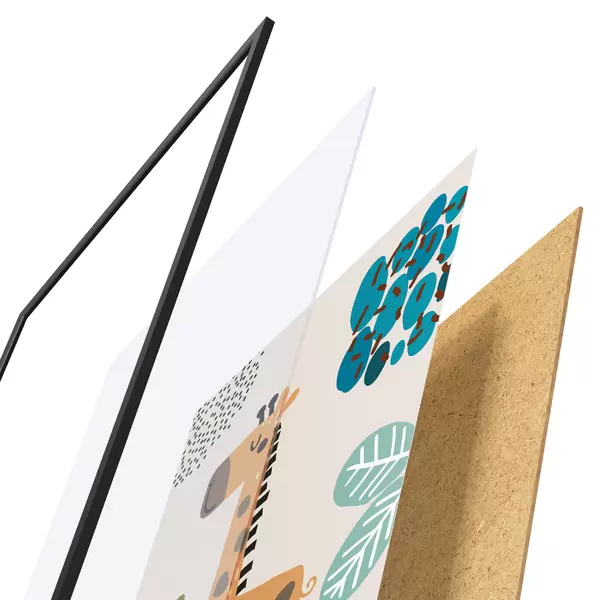 El póster consta de marco, plexiglás, imagen impresa y soporte de aglomerado. El póster puede colgarse inmediatamente en la pared gracias a los soportes de la parte posterior.