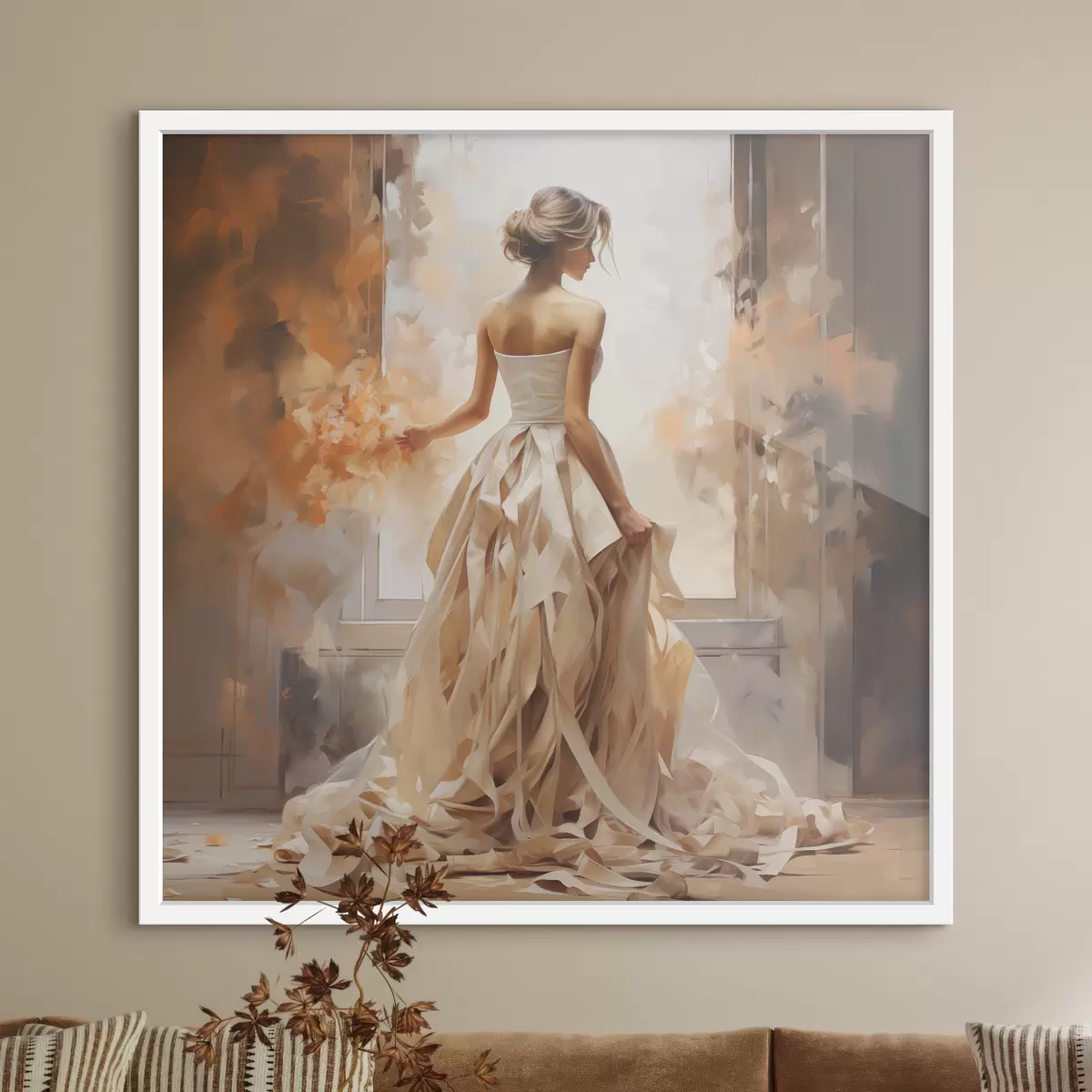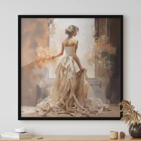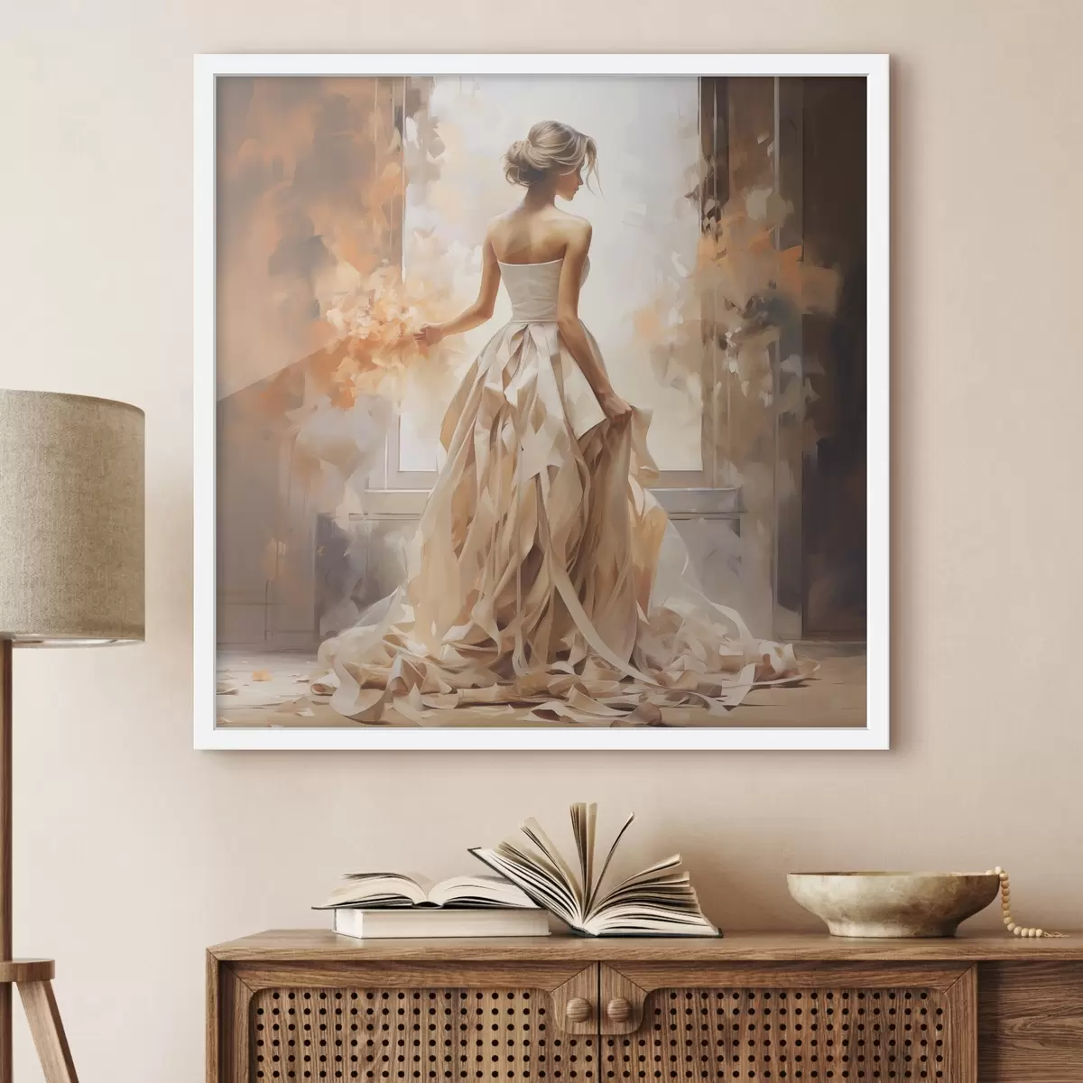 Poster Una chica con un vestido de novia blanco está junto a la ventana entre el fuego y pinta a mano Nr f39125