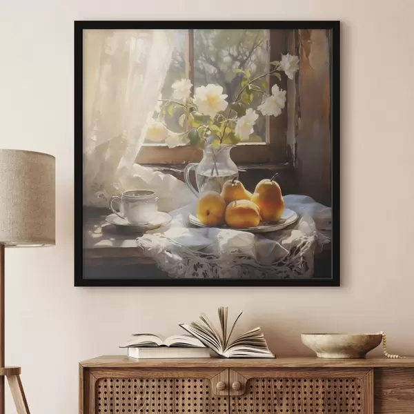 Poster Bodegón rústico con peras amarillas maduras en un plato sobre una mesa junto a la ventana, rosas blancas en una jarra de cristal, cortinas de encaje blanco Nr f39129
