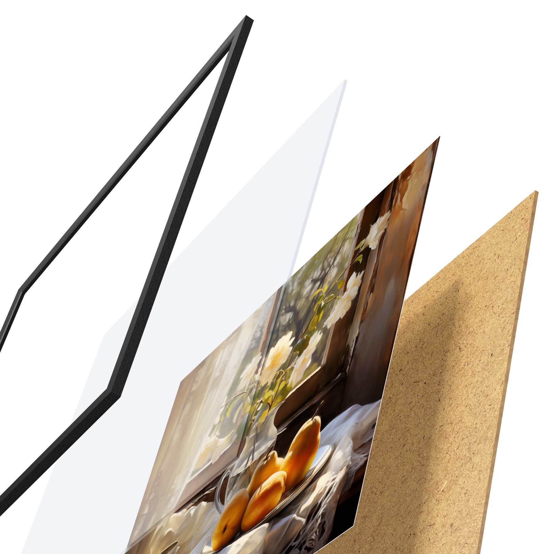 El póster consta de marco, plexiglás, imagen impresa y soporte de aglomerado. El póster puede colgarse inmediatamente en la pared gracias a los soportes de la parte posterior.