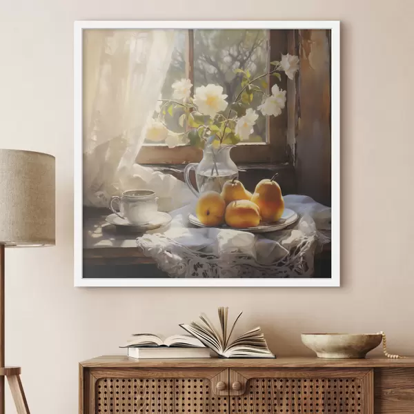 Poster Bodegón rústico con peras amarillas maduras en un plato sobre una mesa junto a la ventana, rosas blancas en una jarra de cristal, cortinas de encaje blanco Nr f39129
