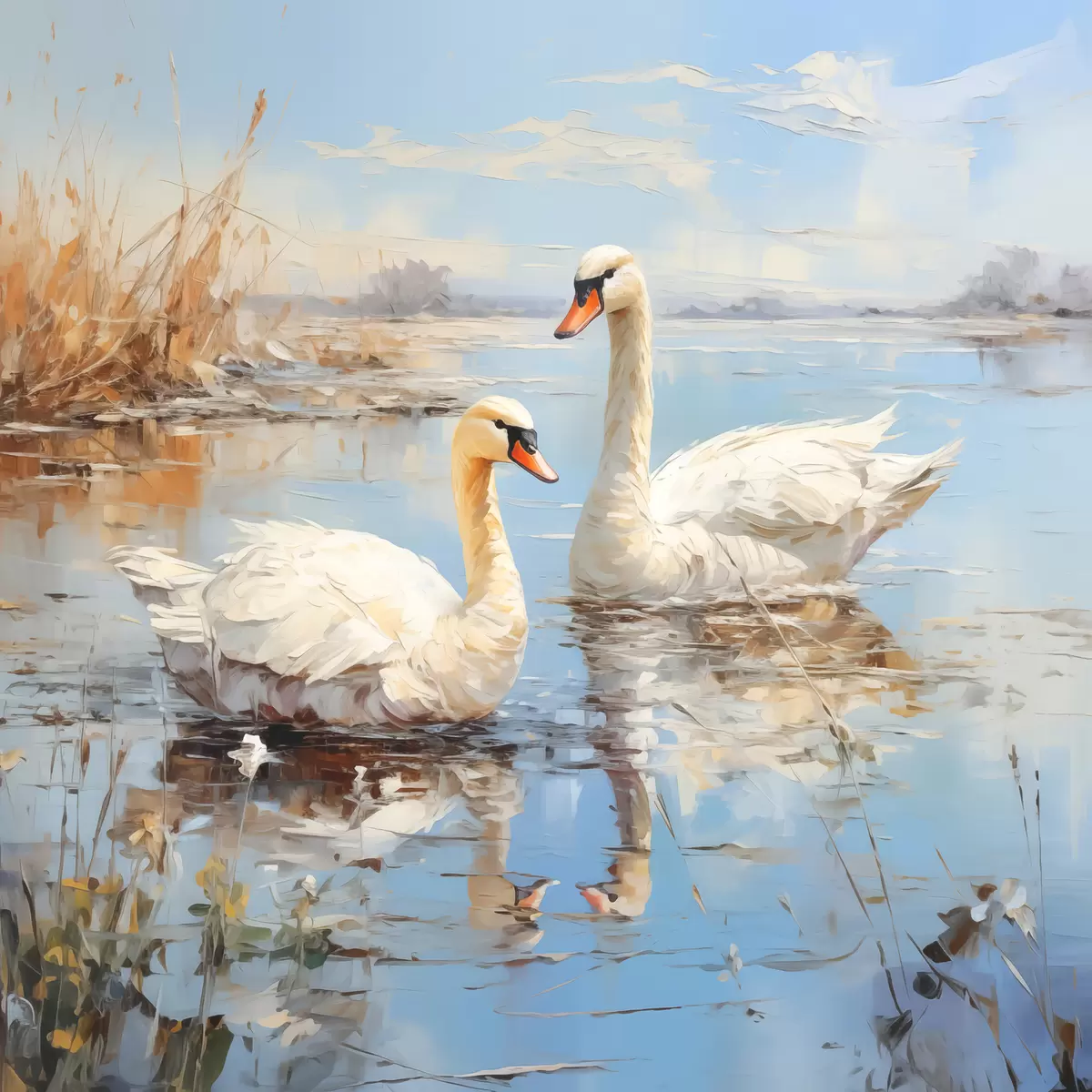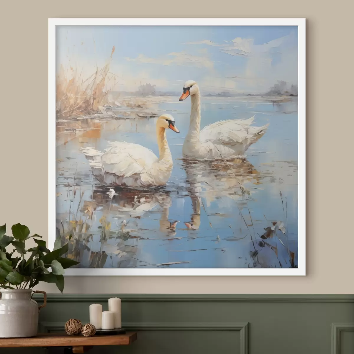Poster Gansos blancos nadan a lo largo del río entre los juncos, azules, blancos, beige f39130