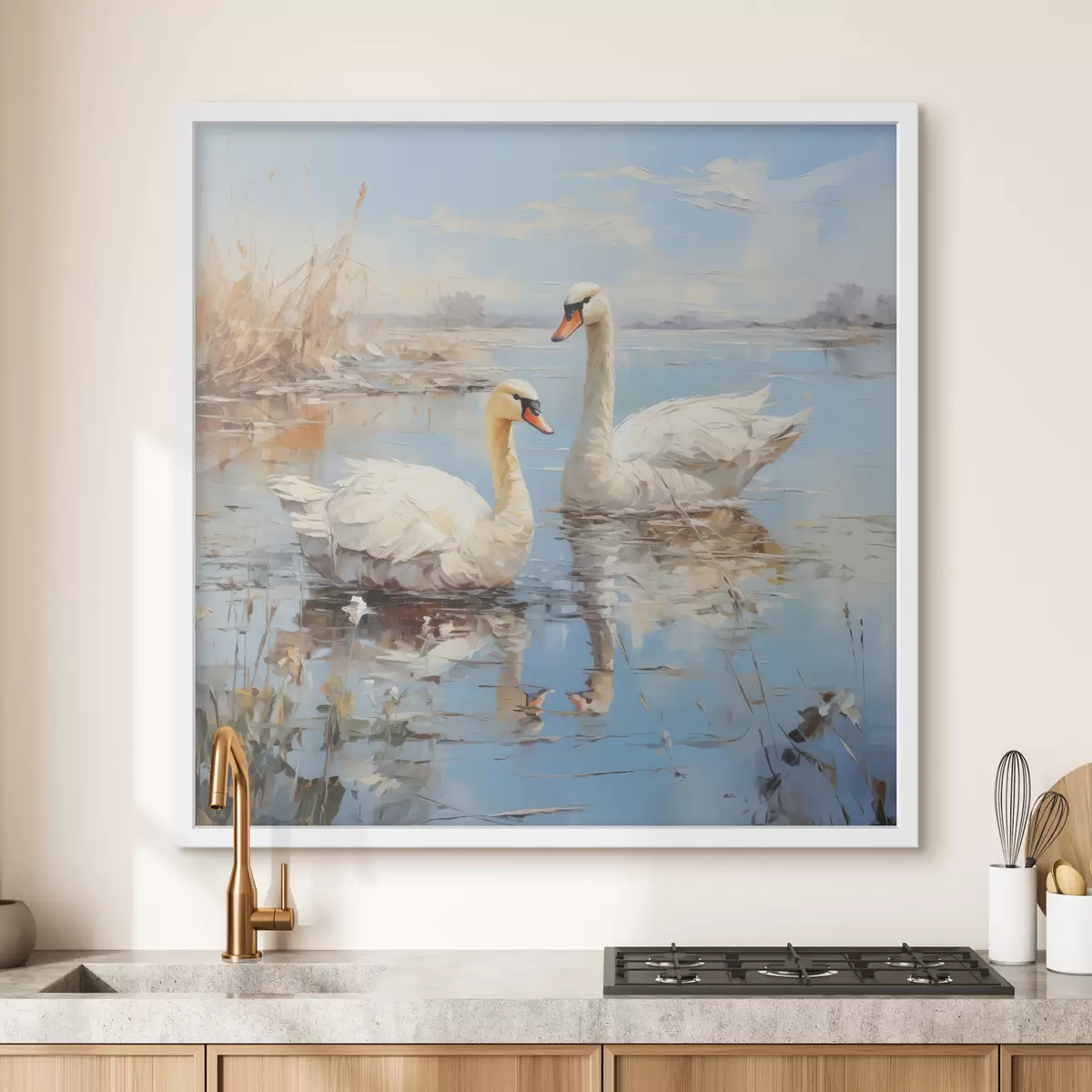 Poster Gansos blancos nadan a lo largo del río entre los juncos, azules, blancos, beige Nr f39130