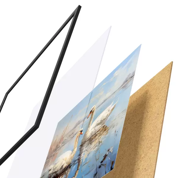 El póster consta de marco, plexiglás, imagen impresa y soporte de aglomerado. El póster puede colgarse inmediatamente en la pared gracias a los soportes de la parte posterior.