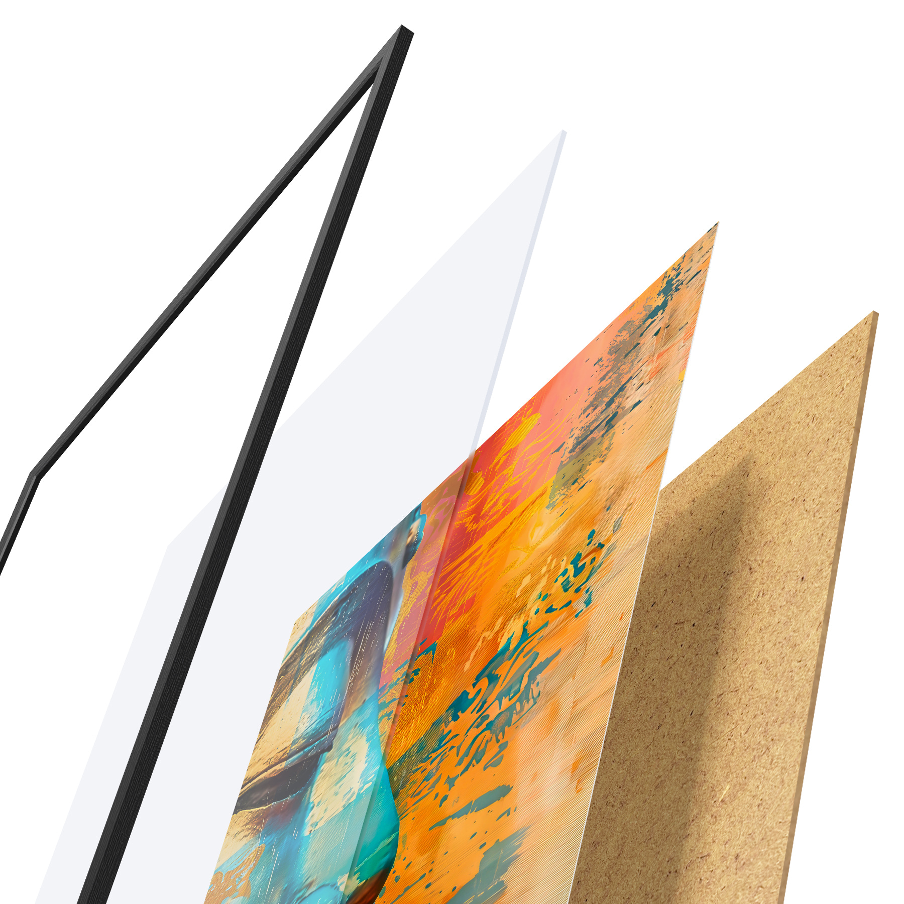 El póster consta de marco, plexiglás, imagen impresa y soporte de aglomerado. El póster puede colgarse inmediatamente en la pared gracias a los soportes de la parte posterior.