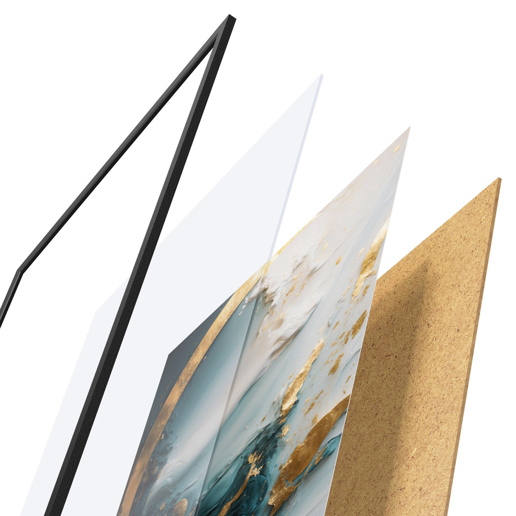 El póster consta de marco, plexiglás, imagen impresa y soporte de aglomerado. El póster puede colgarse inmediatamente en la pared gracias a los soportes de la parte posterior.