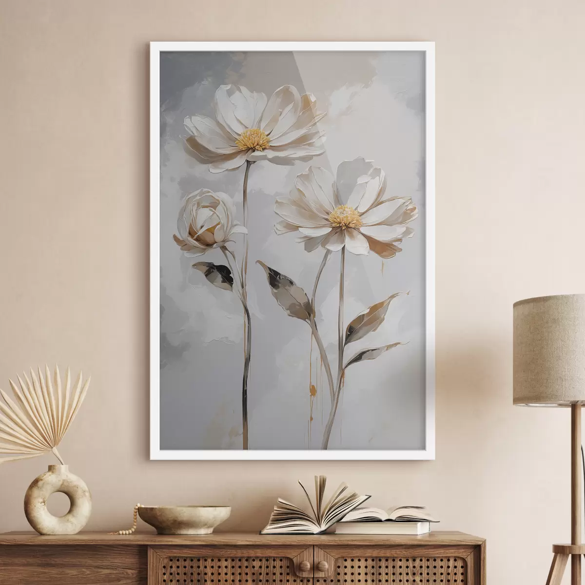 Poster Flores blancas sobre fondo blanco-gris. Nr f39174
