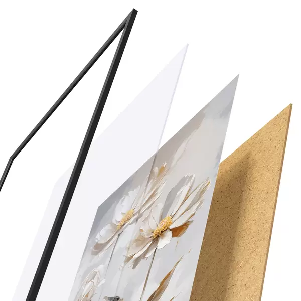 El póster consta de marco, plexiglás, imagen impresa y soporte de aglomerado. El póster puede colgarse inmediatamente en la pared gracias a los soportes de la parte posterior.