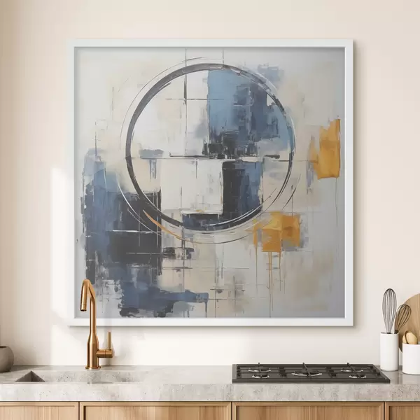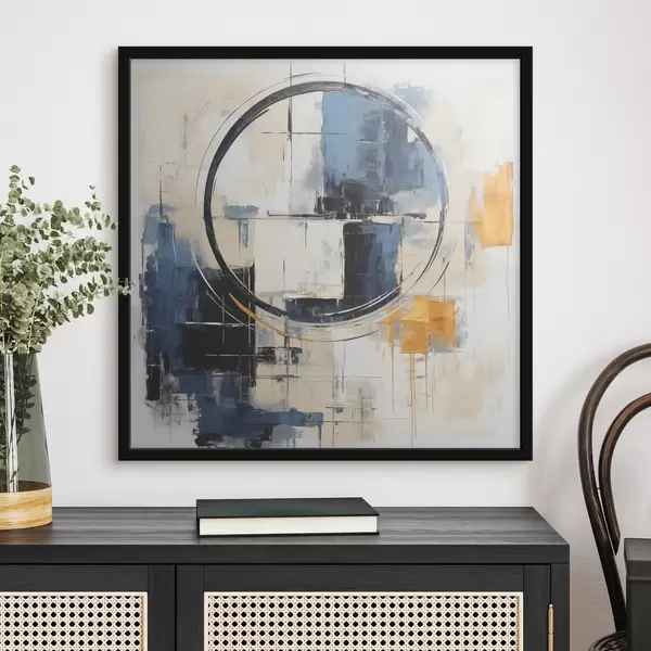 Poster Cubismo abstracto, trazos azules, naranjas, blancos, figura circular. Nr f39179