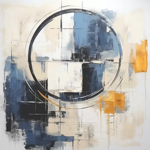 Poster Cubismo abstracto, trazos azules, naranjas, blancos, figura circular. Nr f39179