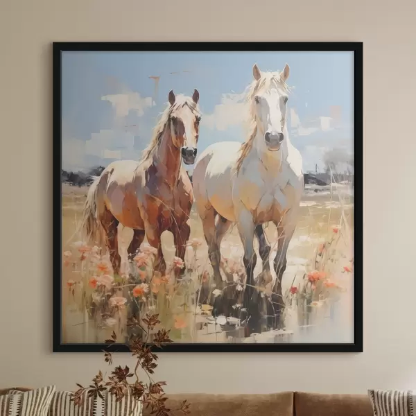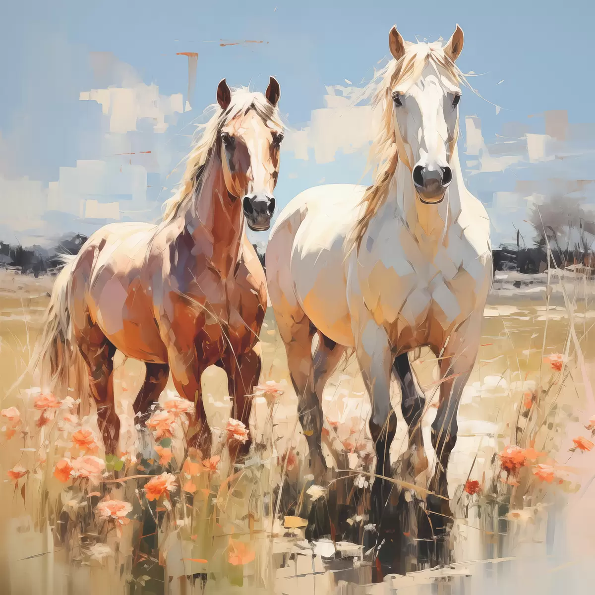 Poster Caballos blancos y marrones pastan en un prado entre flores silvestres, pintura al óleo, arte abstracto f39187