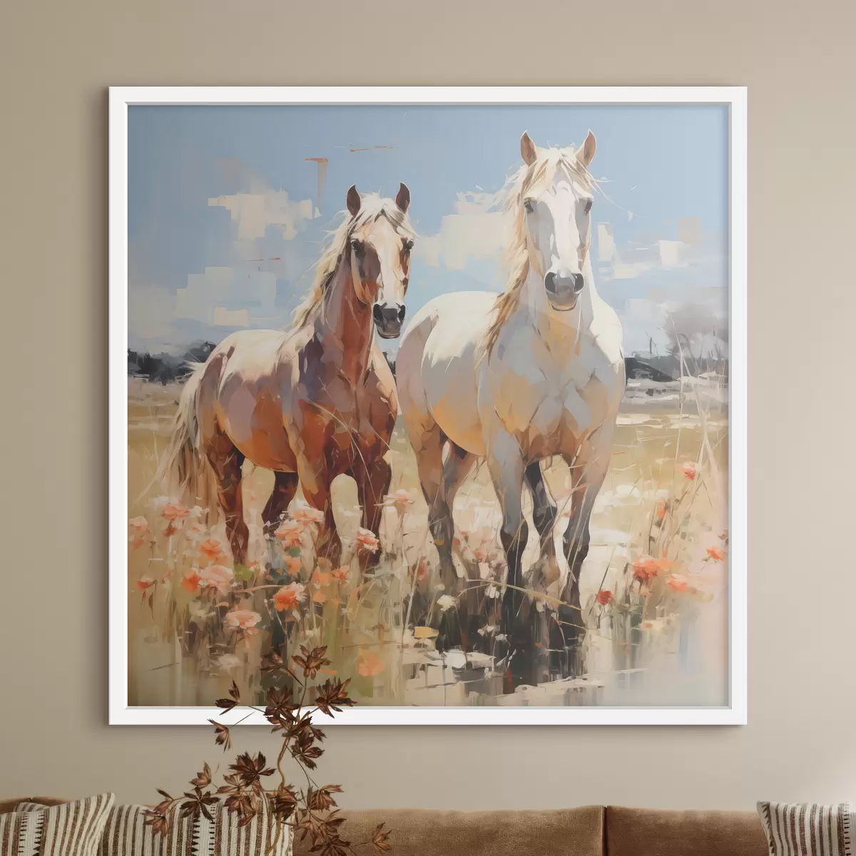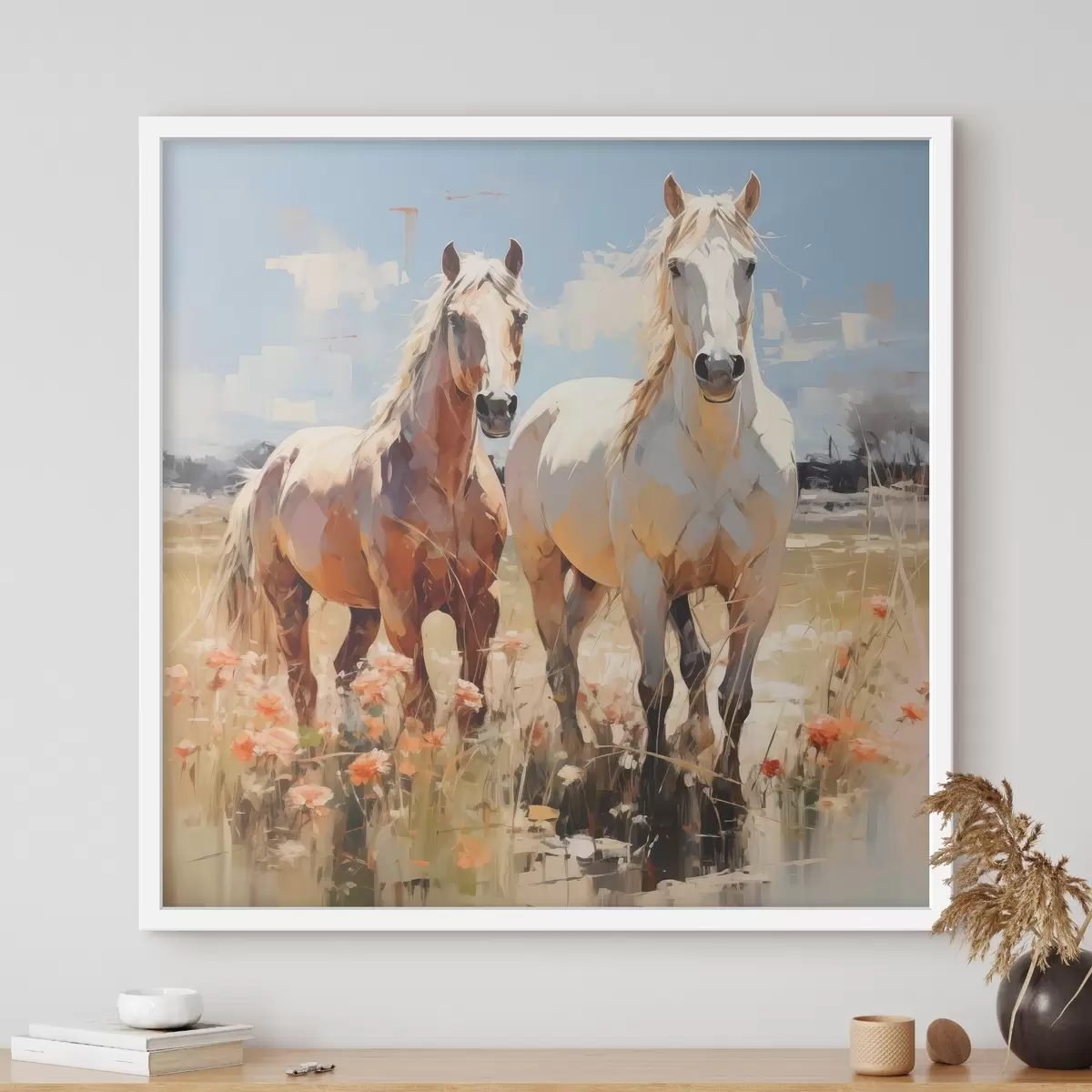 Poster Caballos blancos y marrones pastan en un prado entre flores silvestres, pintura al óleo, arte abstracto Nr f39187