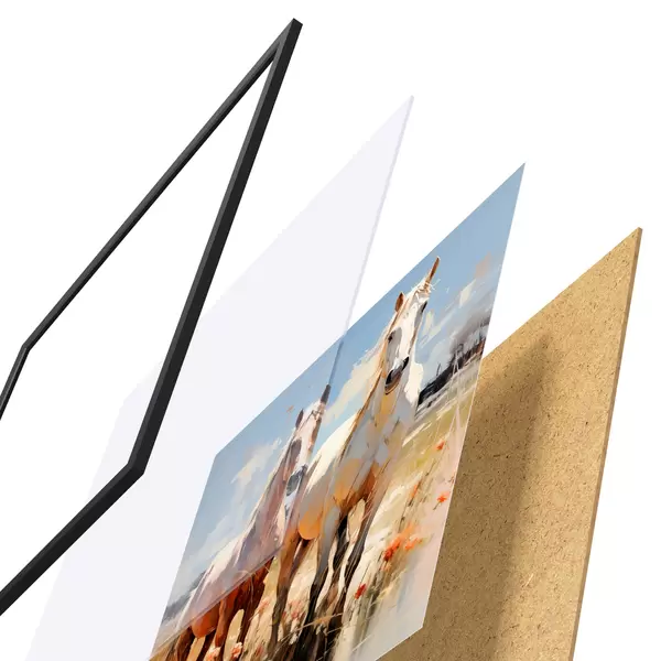 El póster consta de marco, plexiglás, imagen impresa y soporte de aglomerado. El póster puede colgarse inmediatamente en la pared gracias a los soportes de la parte posterior.
