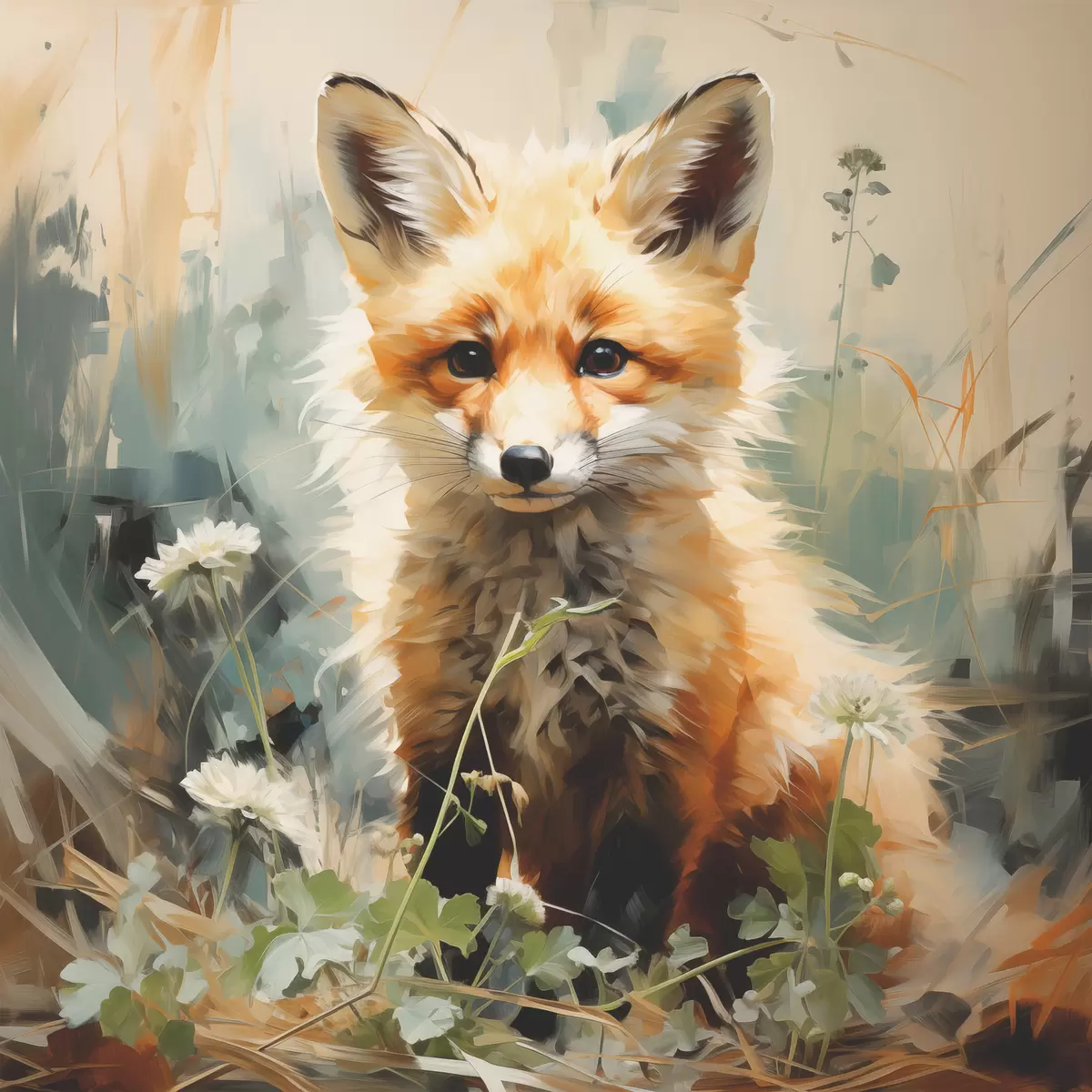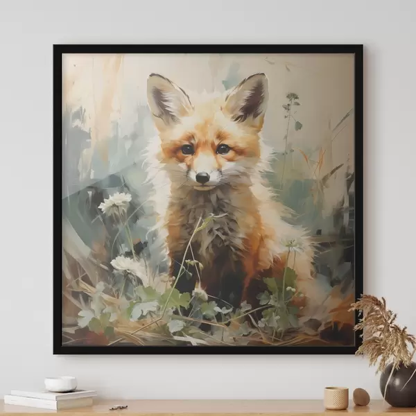 Poster Zorro rojo sentado en hierba seca sobre fondo verde. Pintura al óleo Nr f39191