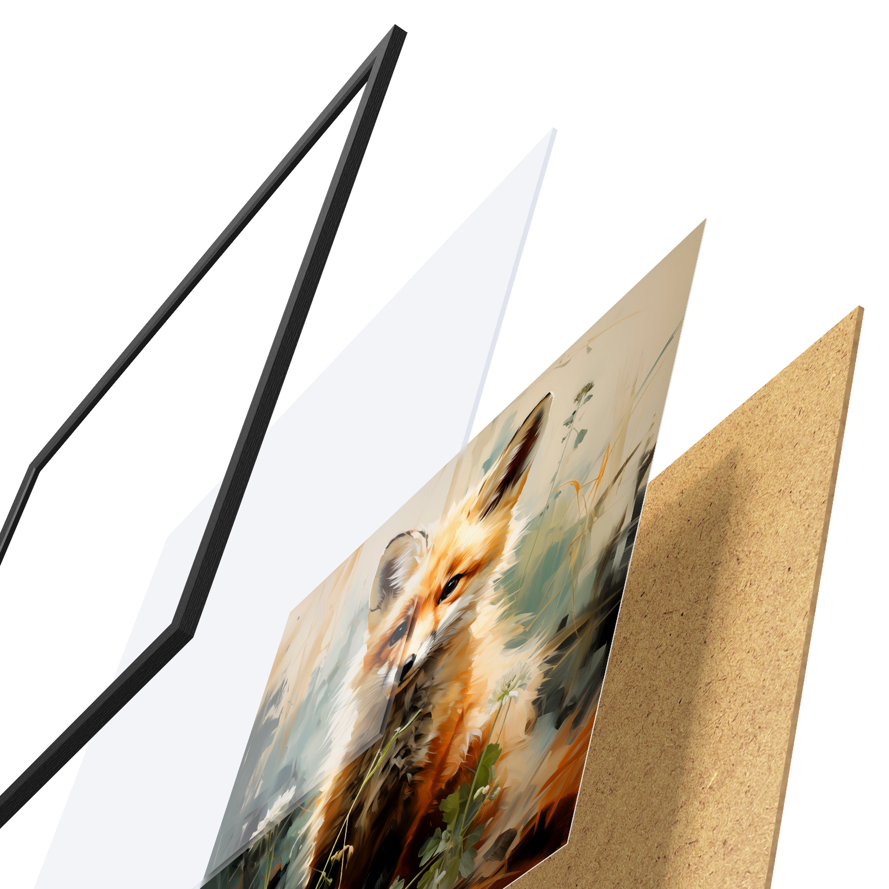 El póster consta de marco, plexiglás, imagen impresa y soporte de aglomerado. El póster puede colgarse inmediatamente en la pared gracias a los soportes de la parte posterior.