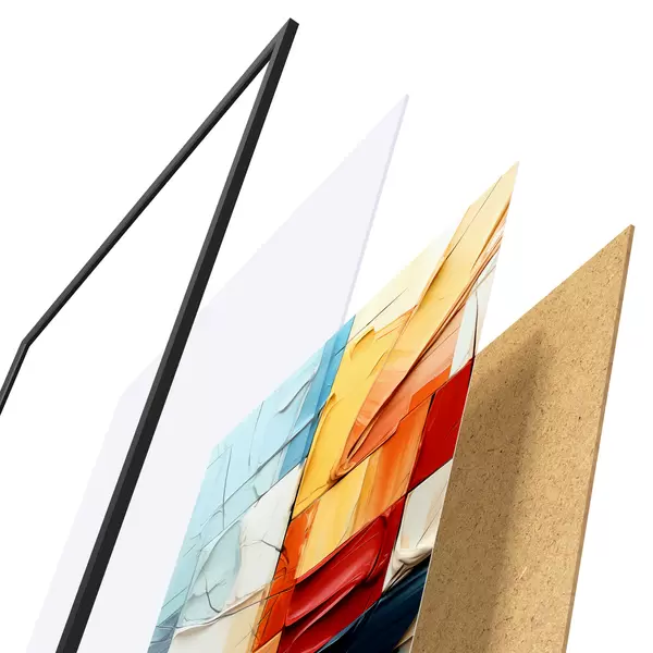 El póster consta de marco, plexiglás, imagen impresa y soporte de aglomerado. El póster puede colgarse inmediatamente en la pared gracias a los soportes de la parte posterior.