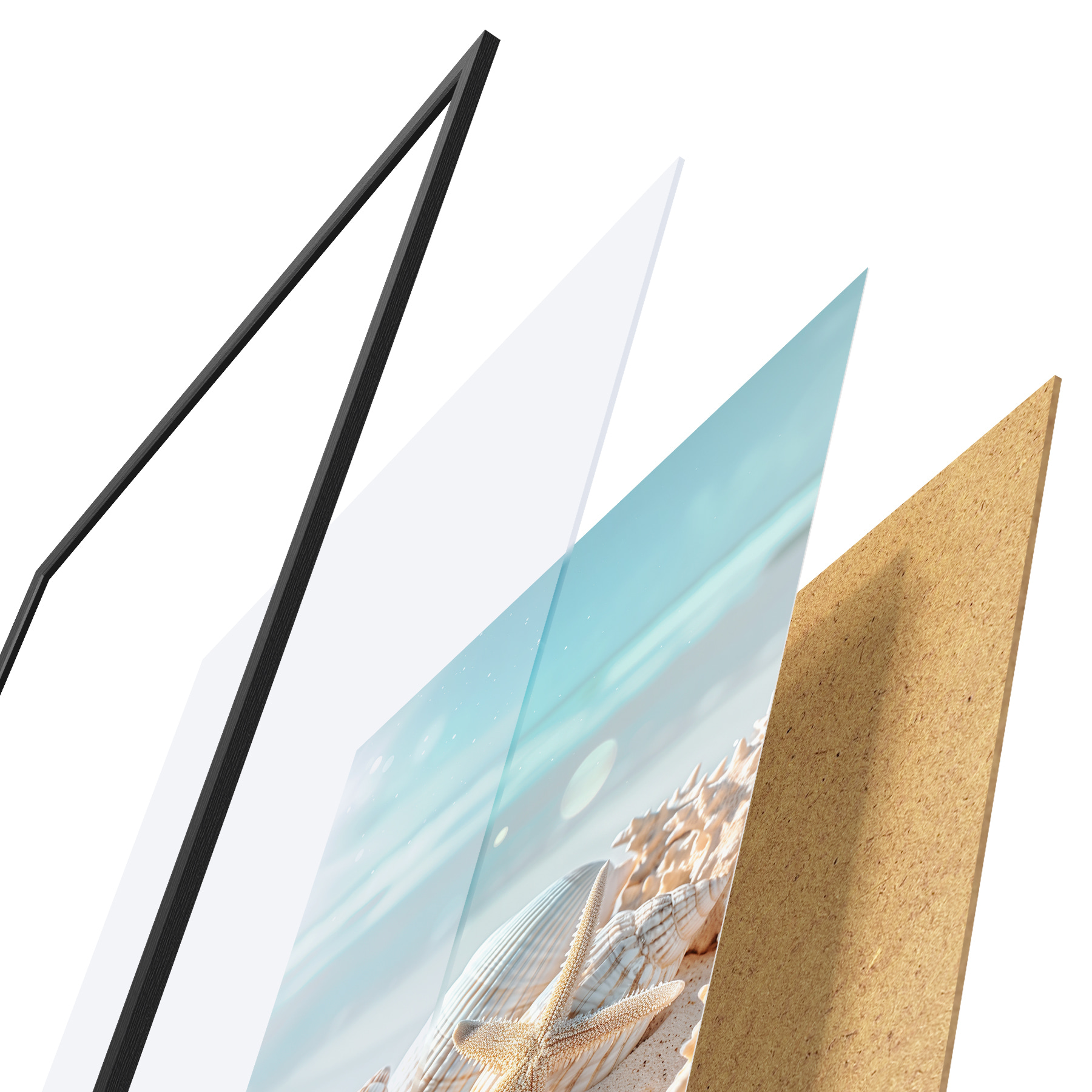 El póster consta de marco, plexiglás, imagen impresa y soporte de aglomerado. El póster puede colgarse inmediatamente en la pared gracias a los soportes de la parte posterior.