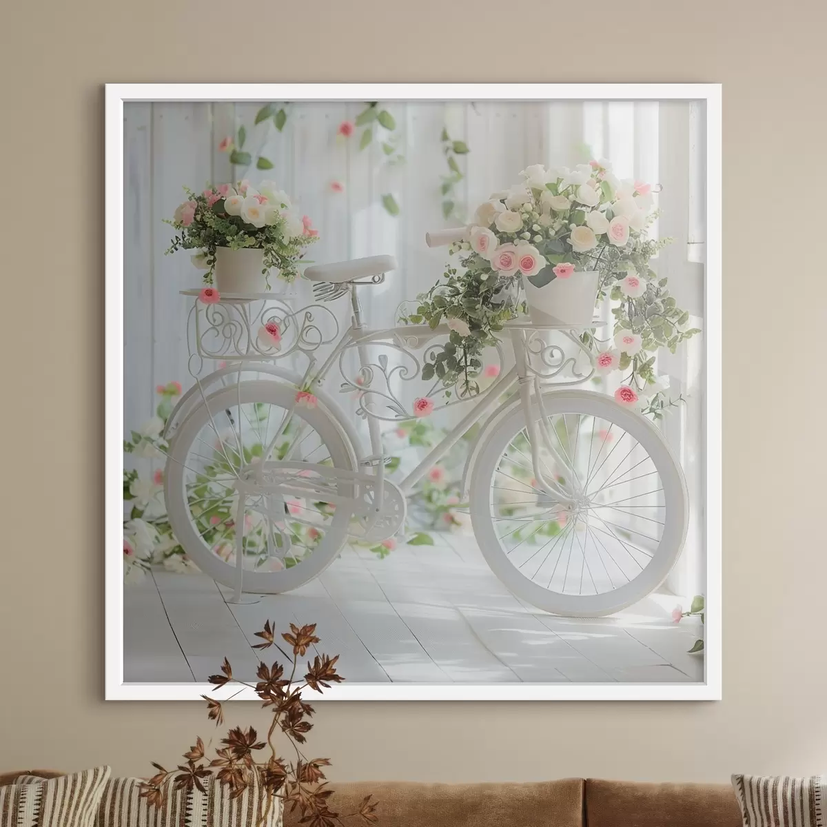 Poster Bicicleta blanca con cesta de flores de estilo provenzal f39243