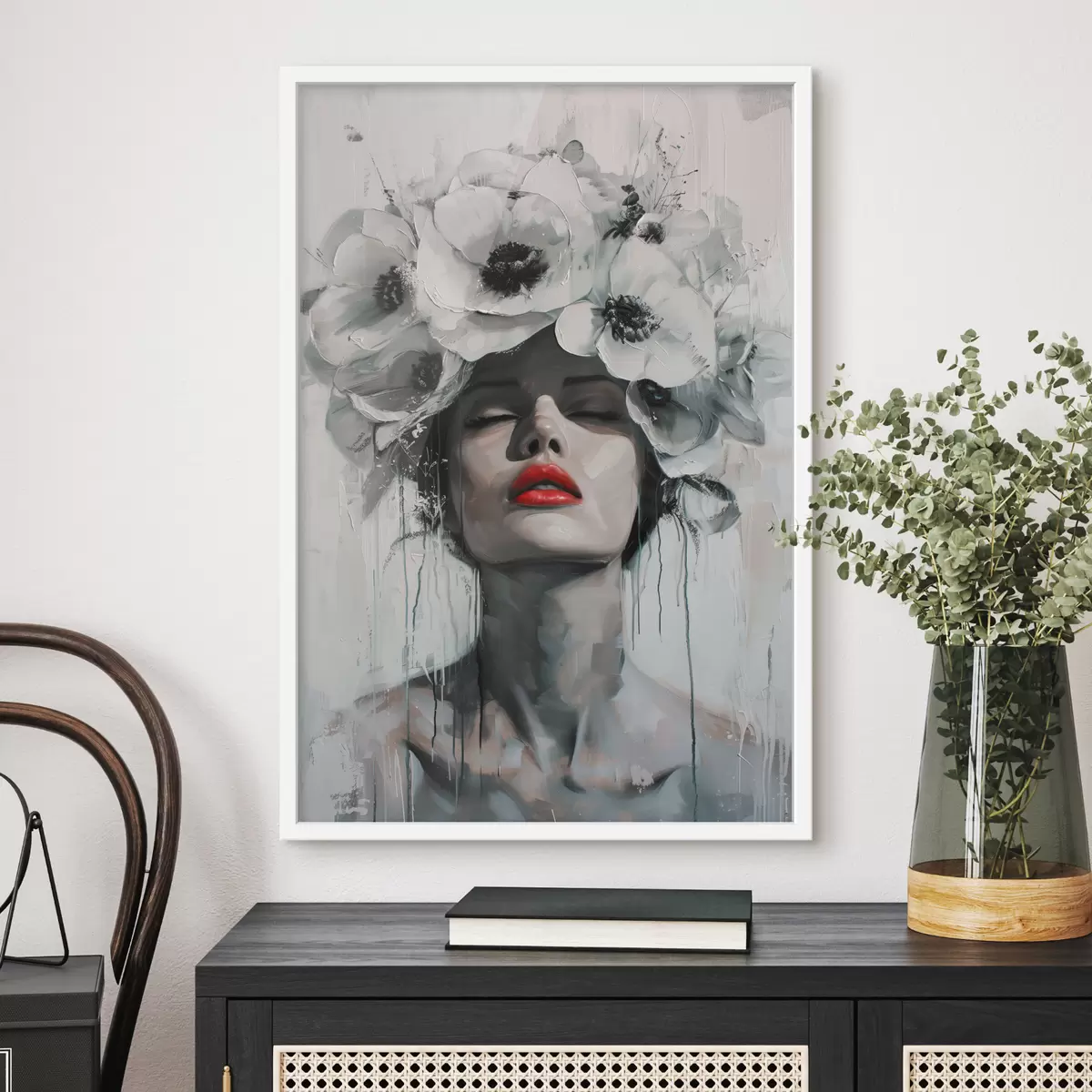 Poster Retrato de una mujer con flores en el pelo y labios rojos. Nr f39253