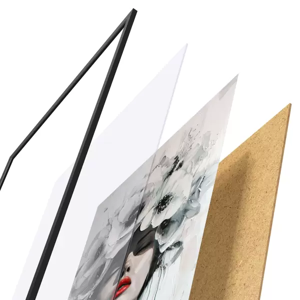 El póster consta de marco, plexiglás, imagen impresa y soporte de aglomerado. El póster puede colgarse inmediatamente en la pared gracias a los soportes de la parte posterior.