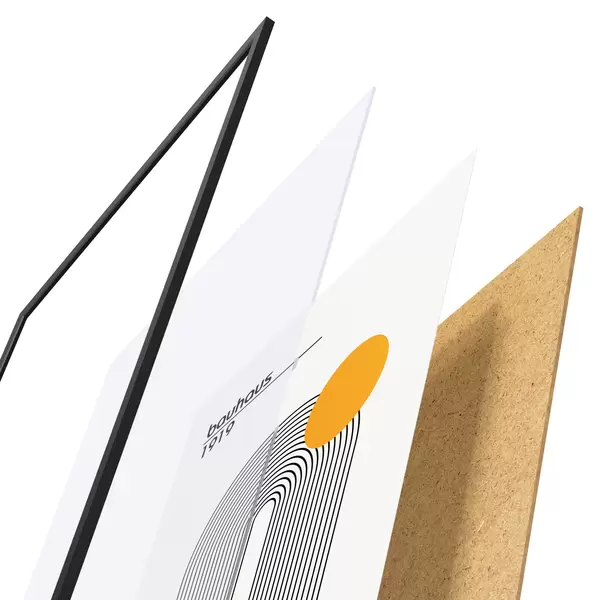 El póster consta de marco, plexiglás, imagen impresa y soporte de aglomerado. El póster puede colgarse inmediatamente en la pared gracias a los soportes de la parte posterior.