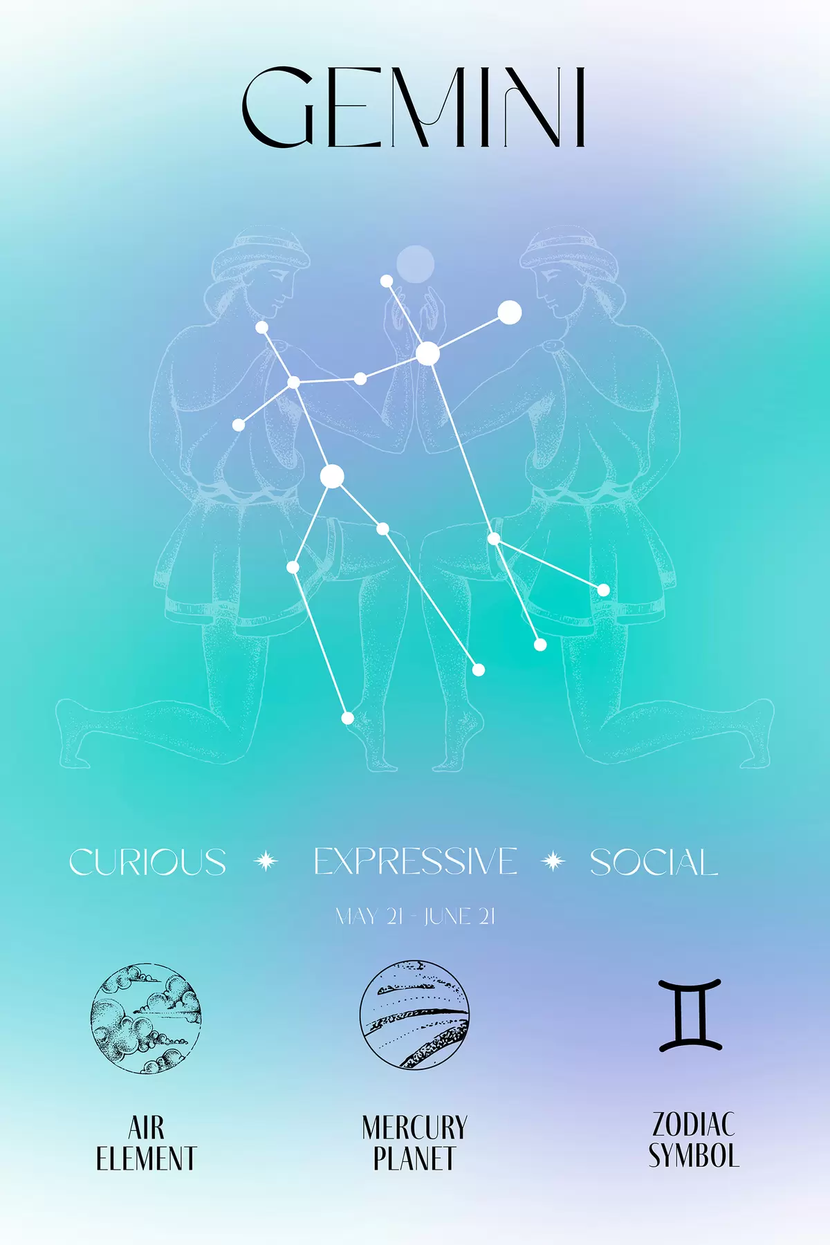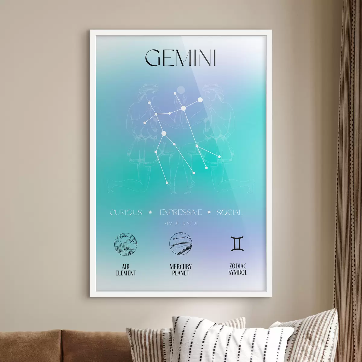 Poster Signo del zodiaco Géminis, constelaciones, cósmico, planetas, astrología, colores azul y morado. Nr f39279